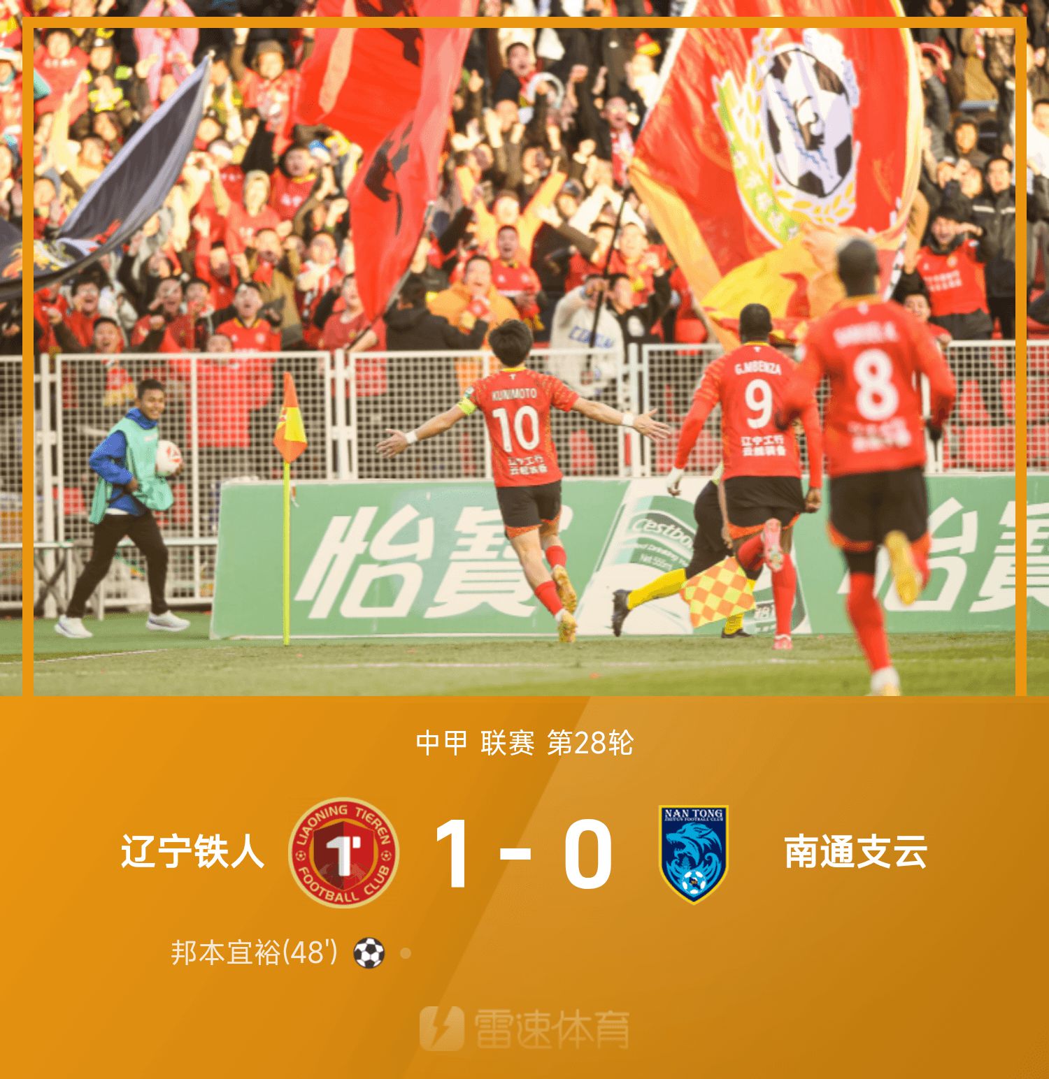 6686 Sports รายงานเมื่อวันที่ 26 ตุลาคมว่าในรอบที่ 28 ของลีกจีนวันปี 2025 เหลียวหนิงไอรอนแมนเล่นเป็นทีมเจ้าบ้านกับหนานทง ซีหยุน ในครึ่งแรกของฤดูกาลนี้ ทั้งสองฝ่ายต่างทำประตูไม่ได้ หลังจากเปลี่ยนข้างและสู้อีกครั้ง คูนิโมโตะ ยี่หยู จ่ายบอลด้วยเท้าใหญ่ของ เกา เจียหรุน จากบนโค้งแล้วผลักมุมไกลเพื่อทำประตู จบเกม เหลียวหนิง ไอรอนแมน เอาชนะ หนานทง จือหยุน 1-0 ล็อคแชมป์ลีกจีน 2 นัดล่วงหน้า ฤดูกาลนี้ และแซงแซงลีกได้สำเร็จ