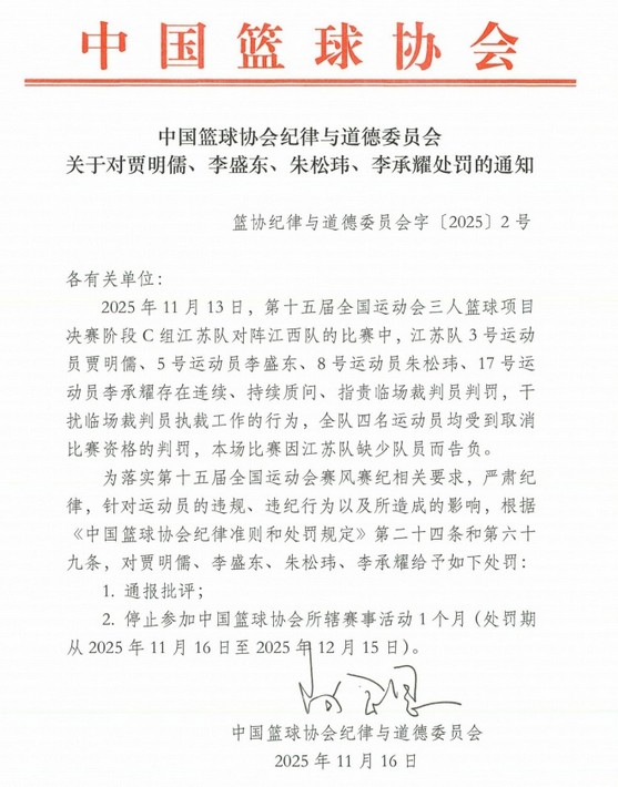 2. ระงับการเข้าร่วมกิจกรรมการแข่งขันภายใต้เขตอำนาจของสมาคมบาสเกตบอลจีนเป็นเวลา 1 เดือน (มีระยะเวลารับโทษตั้งแต่วันที่ 16 พฤศจิกายน 2568 ถึงวันที่ 15 ธันวาคม 2568)