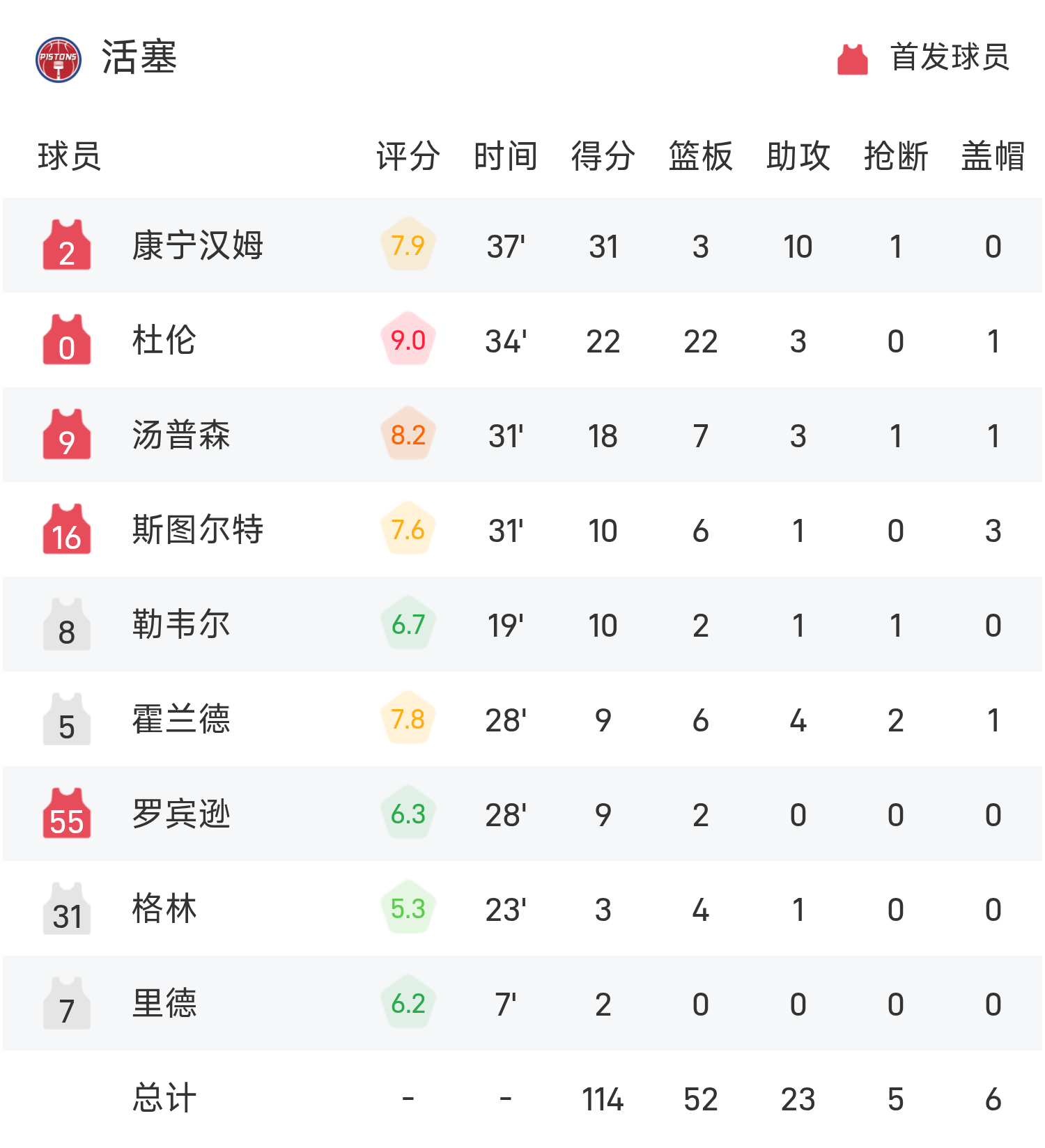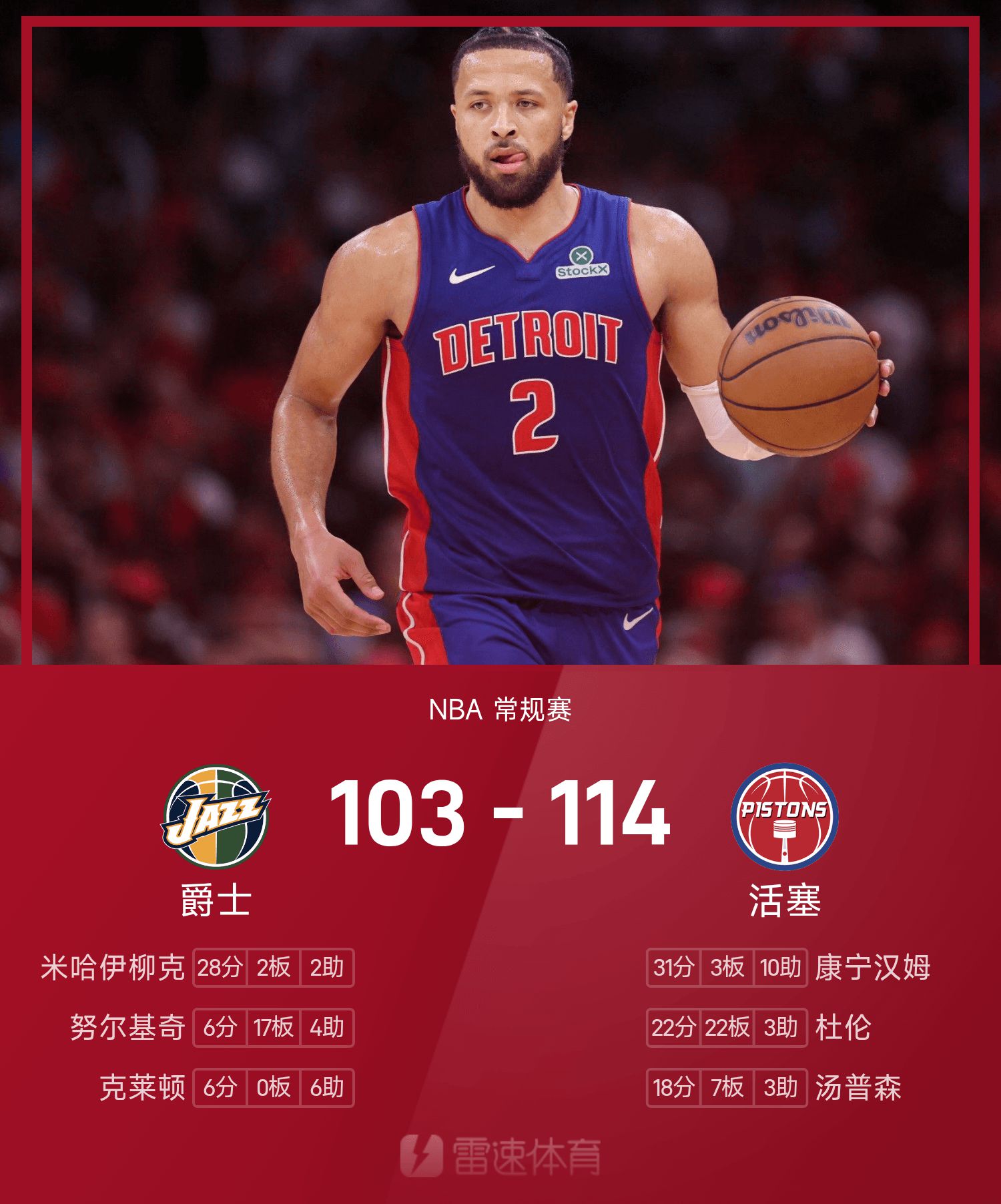 รายงานเกม NBA คันนิงแฮม 31 แต้ม 10 แอสซิสต์ พิสตันส์ 114-103 แจ๊ส